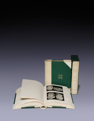 3 volumes, 400 x 305 mm. Numerous plates and descriptions of 966 objects. Original vellum and green cloth, top gilt with others uncut; green cloth slipcases.