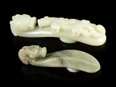 the first a large white jade example, the hook is formed by a horned dragon, the shaft with a high relief carved striding chilong; the second a mottled grey jade example, having a dragon-head terminal and a faceted shaft.