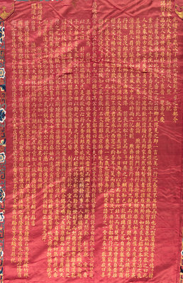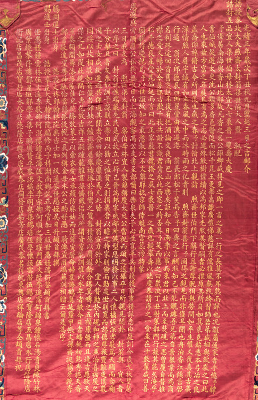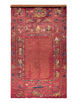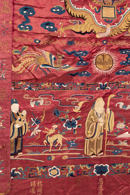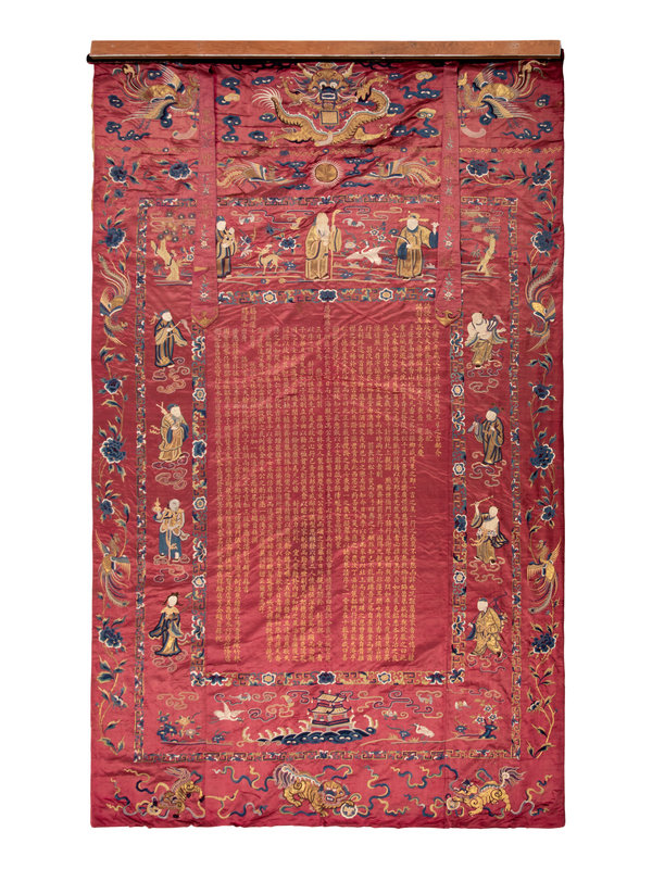 of crimson satin ground with borders of various immortals, dragons, phoenix, and flowers embroidered in silk and couched with gilt wrapped threads surrounding a central inscription celebrating the birthday of Mr. Liang's mother dated to the third year of the Guangxu period corresponding to 1878, mounted on busk linen, with two hanging pendants suspended from a wooden mount.