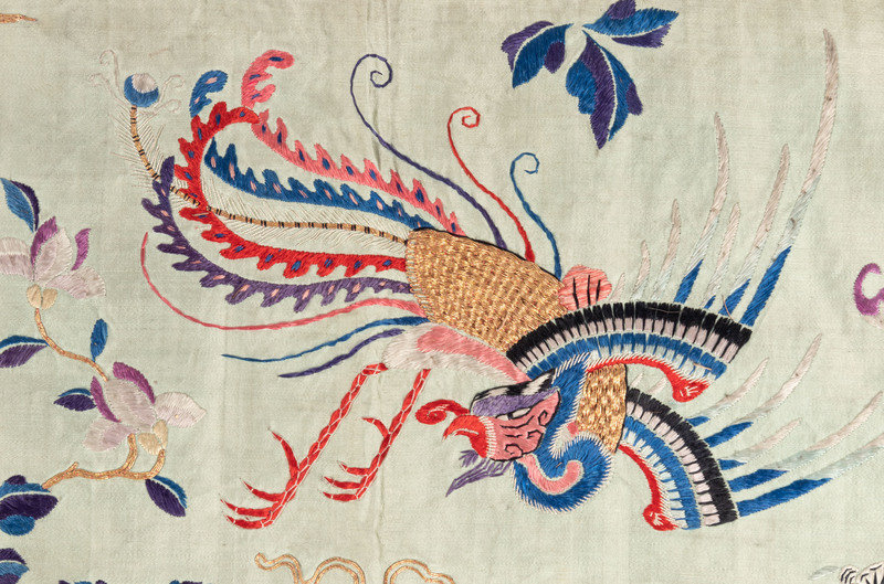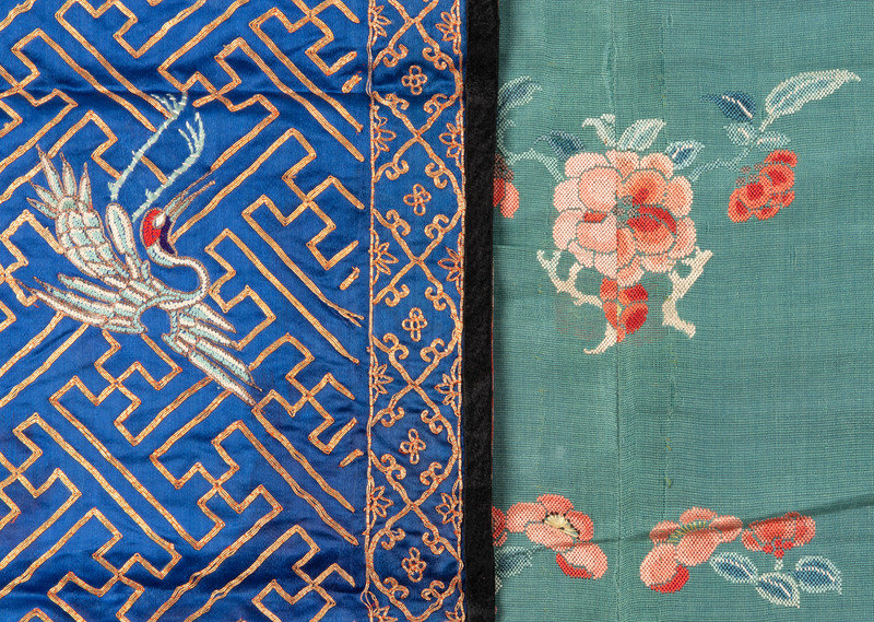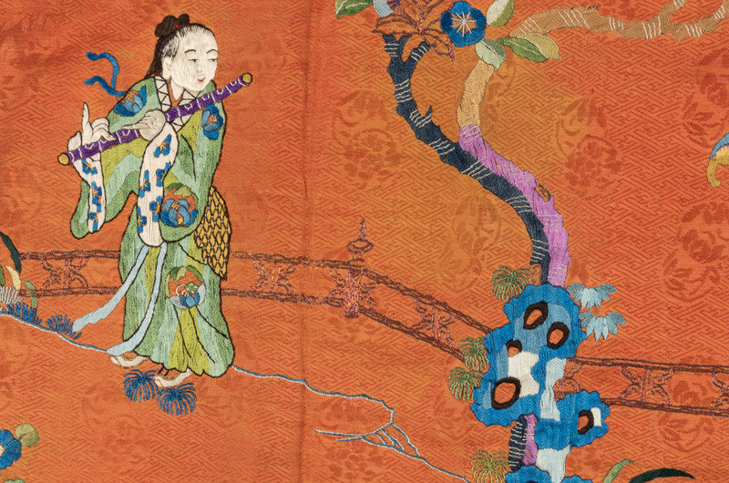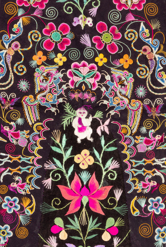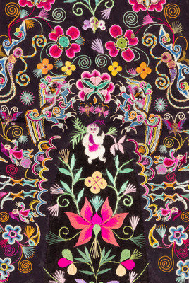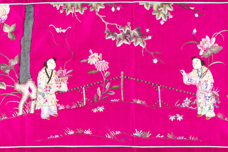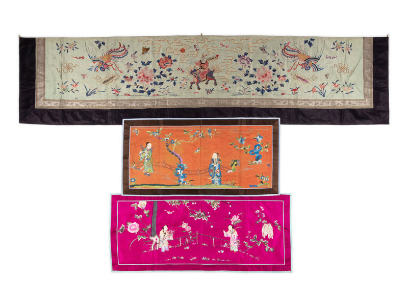 the rectangular panels embroidered with floral and figural motifs works in satin and looped needle stitches against grounds of various vivid satin and plain weave.