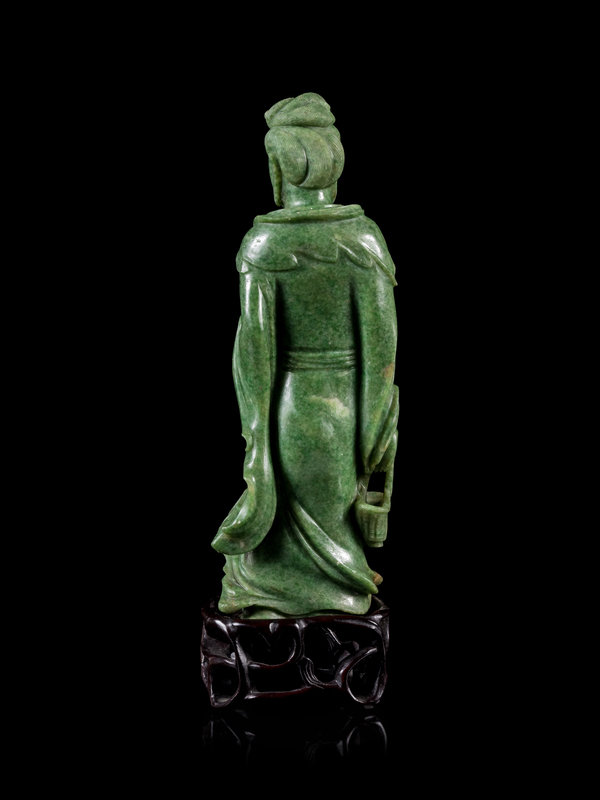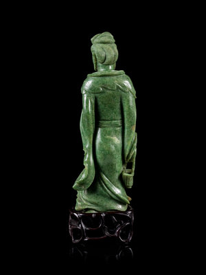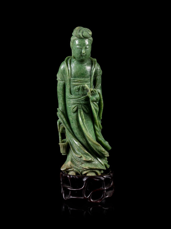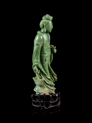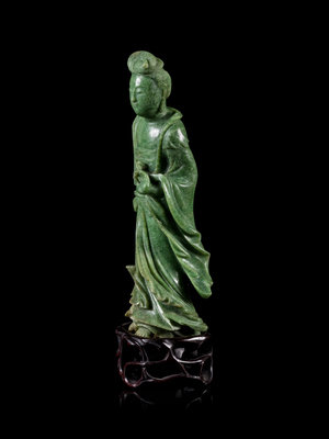 A Mottled Green Jade Figure of Guanyin