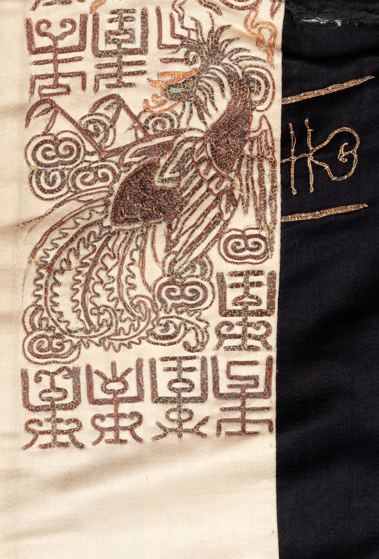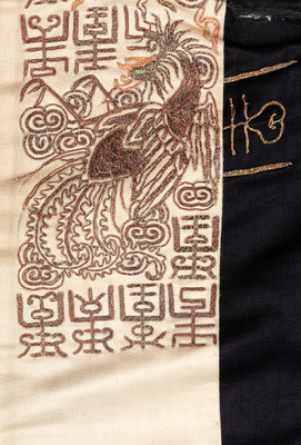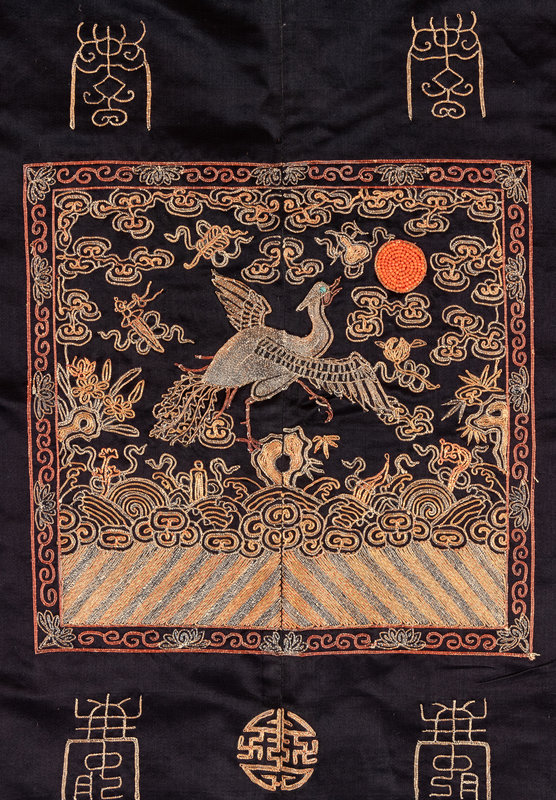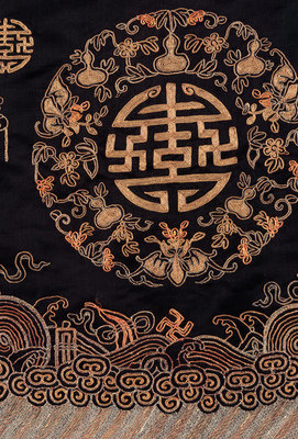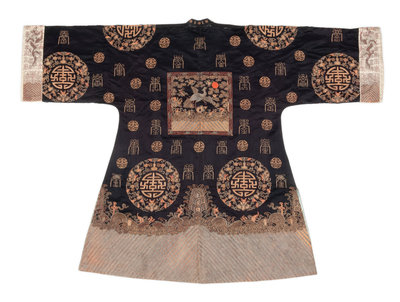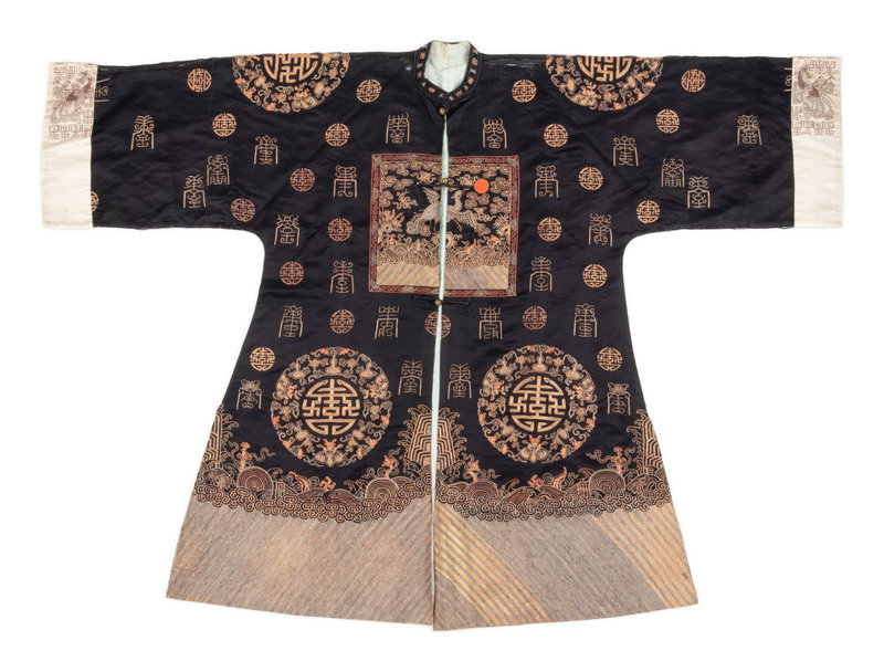 embroidered in gilt wrapped thread to depict shou medallions enclosed by various gourds and entwined leafy vines, amongst scattered shou characters, the center of robe with a 'mandarin duck' rank badge, all reserved on a midnight blue ground above mountain peaks, crashing waves and lishui, the ivory ground cuffs embroidered with phoenix birds surrounded by further shou characters.