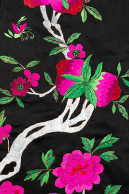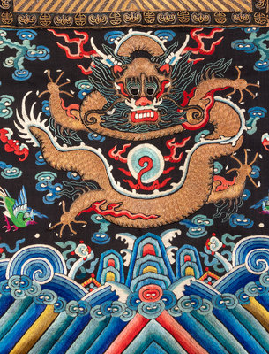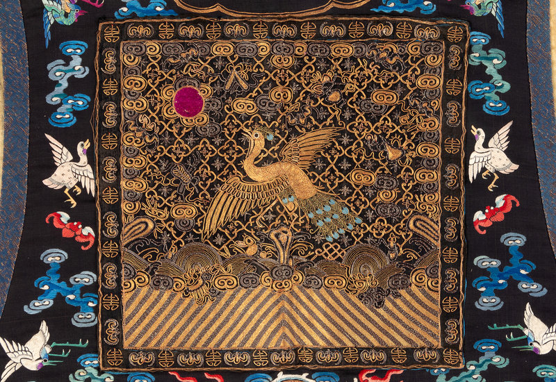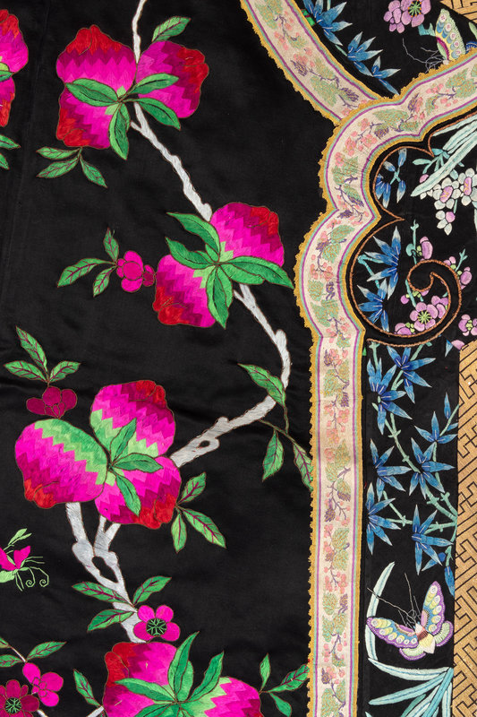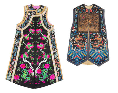 the first a long informal example embroidered with fruiting peach trees against a black satin ground, bordered by applied and gilt borders of brocade and further embroidery, lined in magenta crepe. The second with couched gilt peacock rank badges on a plain black and gold ground, finely embroidered with fierce dragons, birds and flowers above a lishui border.