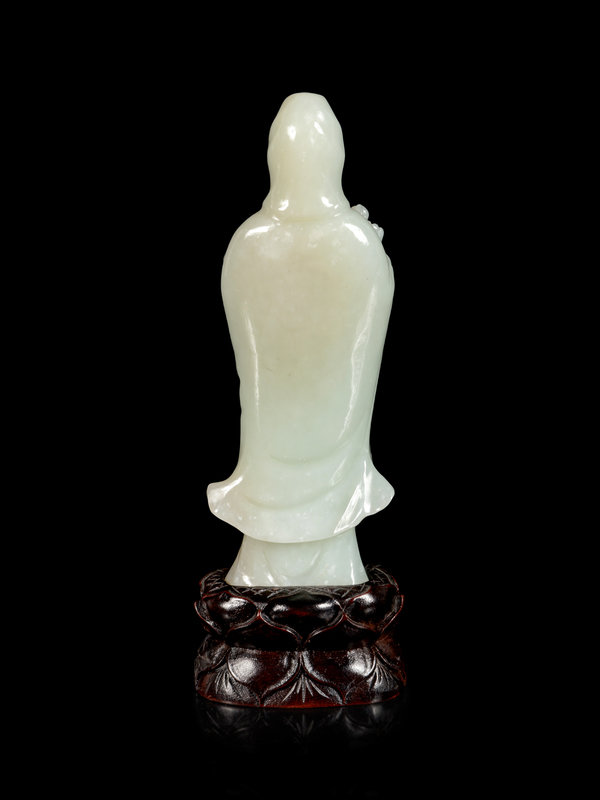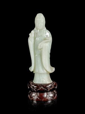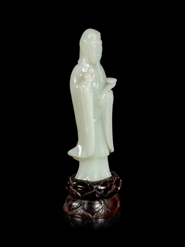 carved from a translucent stone, the figure draped in flowing robes and holding a pearl and ruyi scepter, the eyes downcast in a benevolent expression, raided above a carved hardwood lotus form stand.