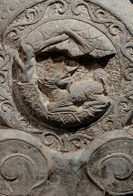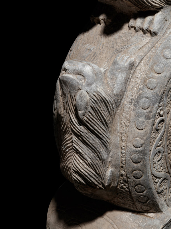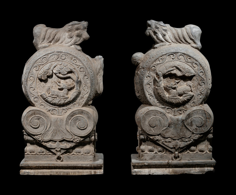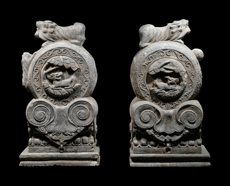 each carved to show a drum with a lion seated atop, the sides carved with medallions enclosing seated qilins in landscapes , supported on a large ruyi head-form base, further raised on a tiered rectangular stand.