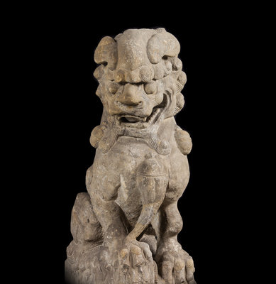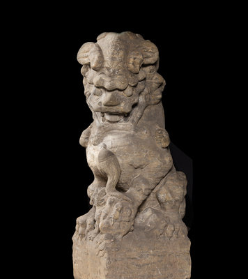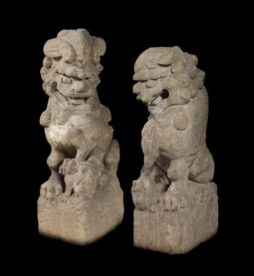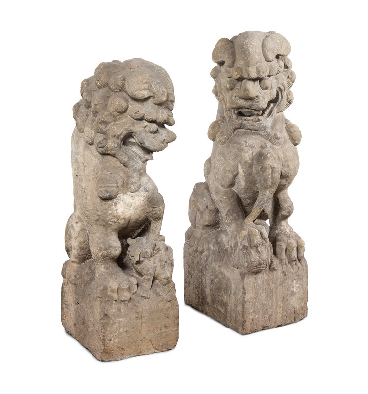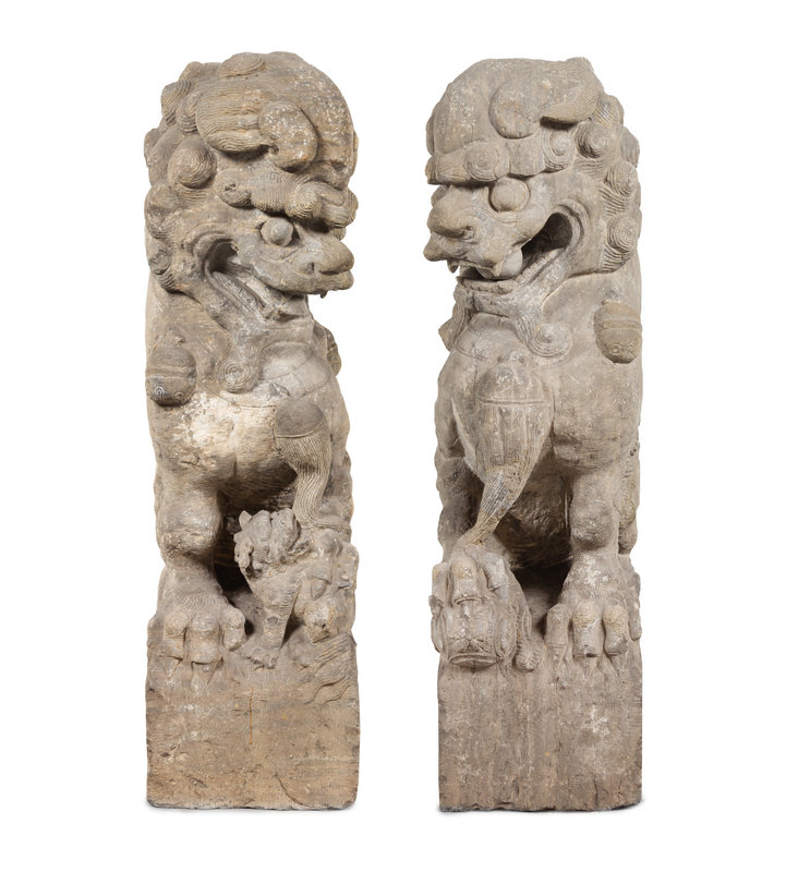 each beast depicted seated atop a rectangular base, the male figure with his front right paw resting on a brocade ball, the female figure with her front left paw placed on her cub.