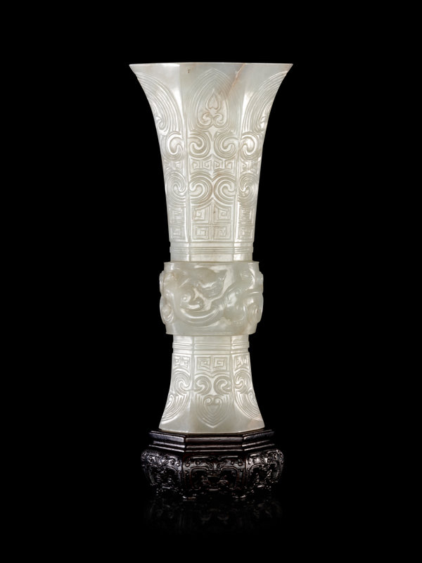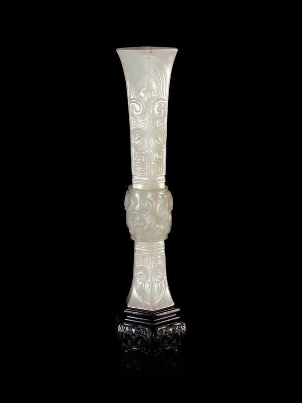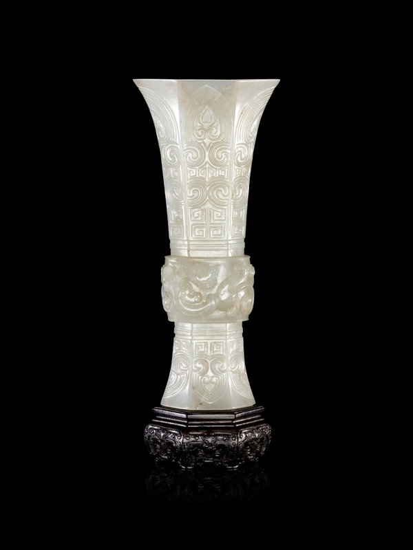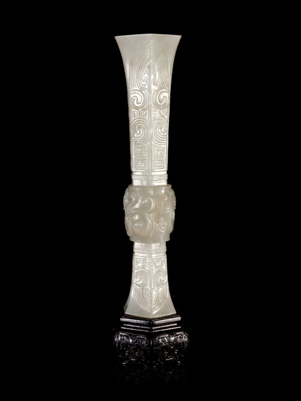the bulbous mid-section carved in high relief with crouching chilongs, between two bands of archaistic blades, the stone of an even color, raised on a hardwood stand finely carved with stylized dragons, raised on a well carved fitted hardwood stand.