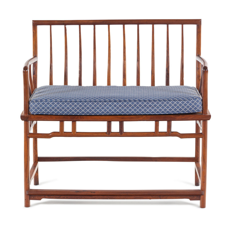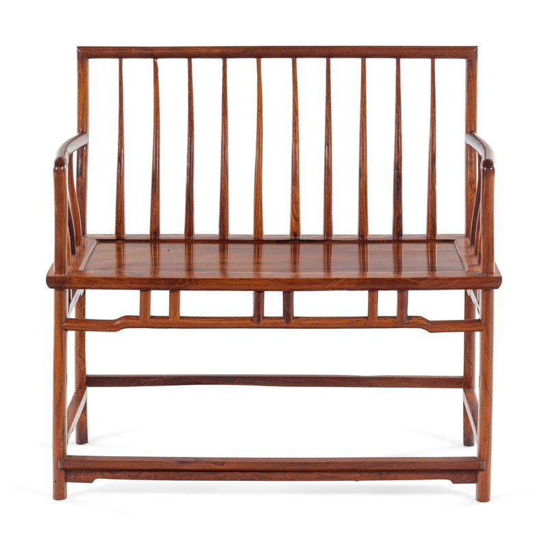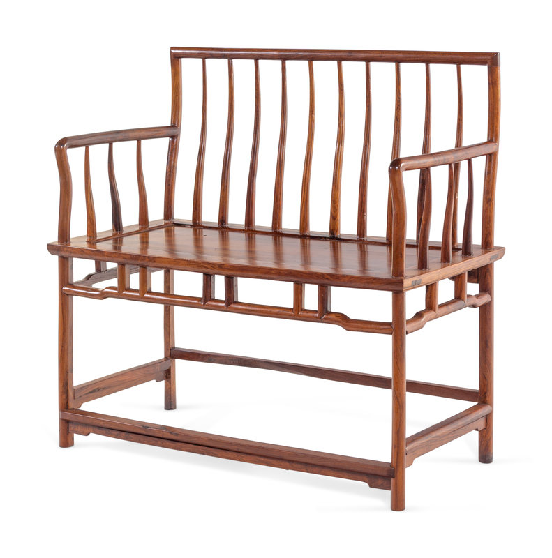the wood seat set within the rectangular frame beneath the straight crest and curved arm rails framing rows of slender wavy struts, above openwork aprons, all raised on legs of rounded section joined by pairs of stretchers above shaped aprons.