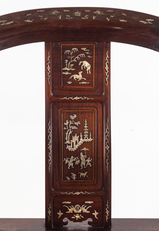 the crestrail inlaid with phoenix amongst ruyi-form clouds, ending in round rounded terminals, the S-curved splat, featuring two enclosed panels, the upper with inlaid bone decoration showing two horses in an outdoor scene, the lower larger panel of figures in landscape, flanked by a pair of reticulated rectangular supports carved with lingzhi fungus and floral blossoms, two pairs of curved sports decorated with inlaid flowers,