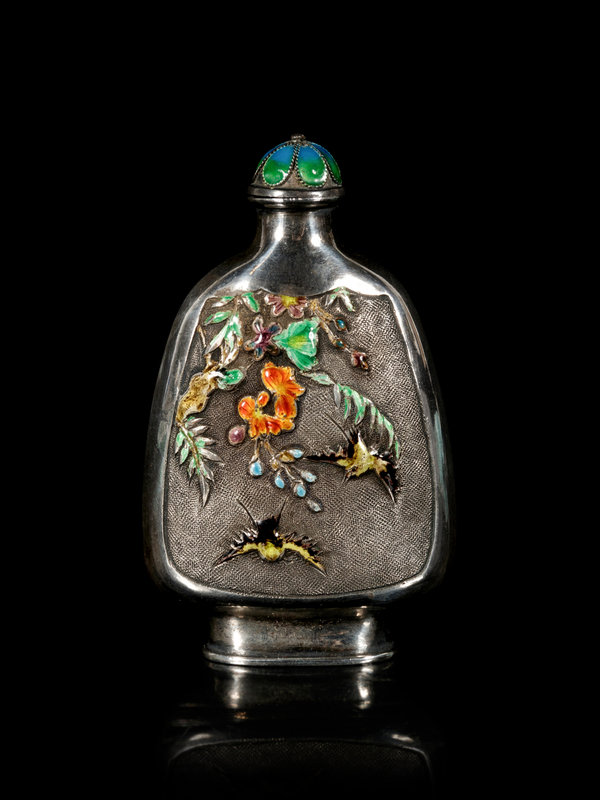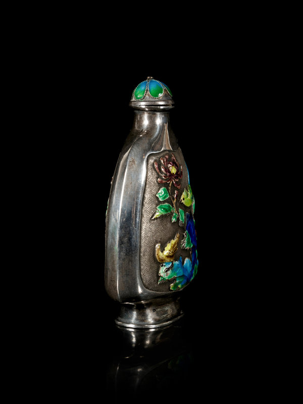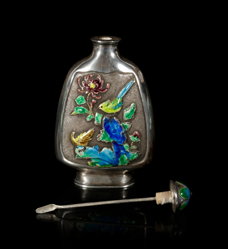 the flattened body enameled on both sides showing birds and flowering branches, raised on a slightly spreading foot, the underside impressed with a Qianlong four-character mark, with matching enameled on silver stopper.