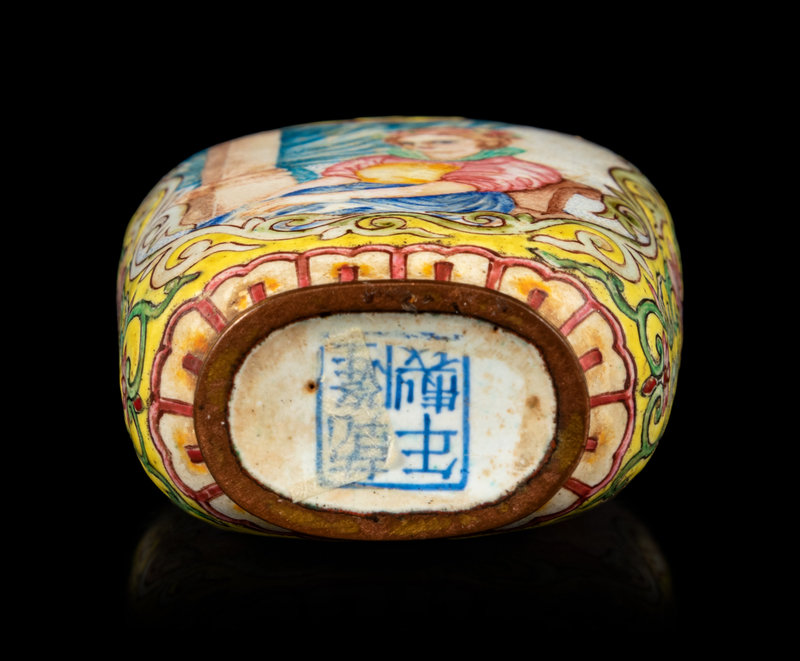 the rectangular bottle resting on a short splayed foot, painted on each side with a shaped panel enclosing a seated European lady, set above a bright yellow ground decorated with lotus scrolls, the underside bearing a Qianlong four-character blue enameled seal mark, with a metal stopper.