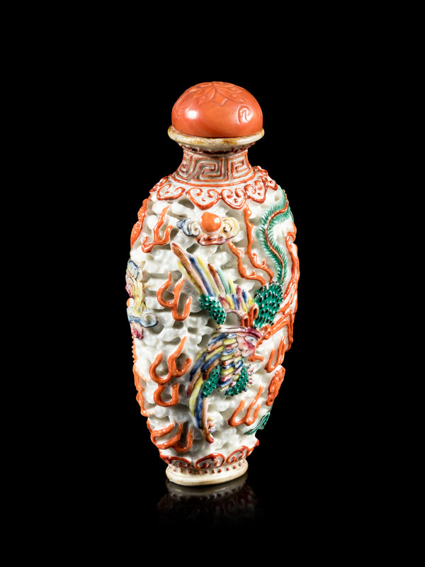 of baluster form decorated with an iron-red dragon on the front and a phoenix on the back, both amongst ruyi-shaped cloud scrolls, red hardstone stopper.
