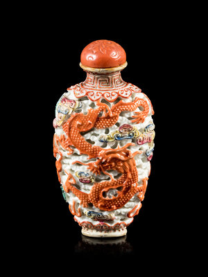 清十九世纪 礬紅粉彩模印龍紋鼻煙壺