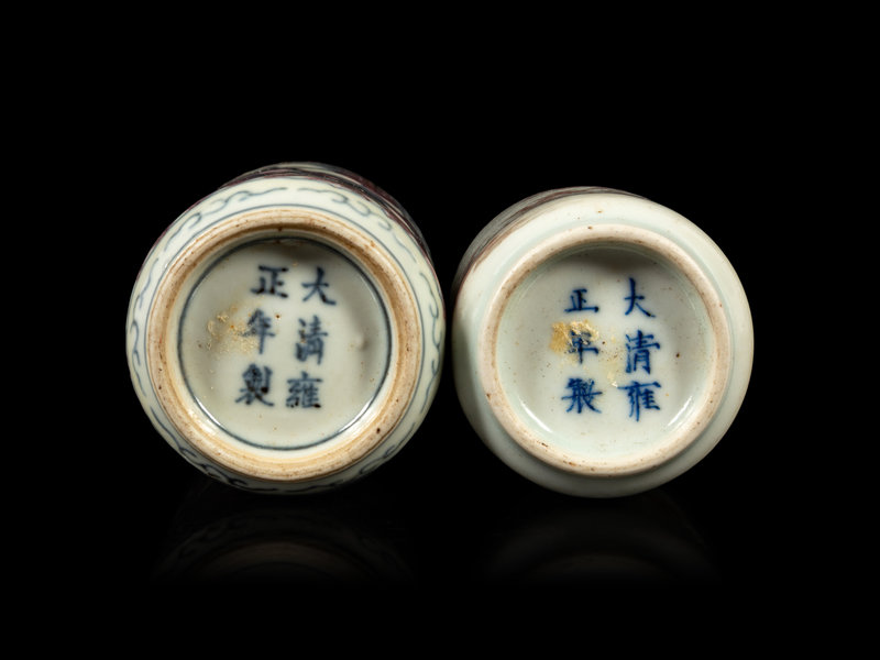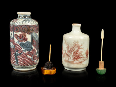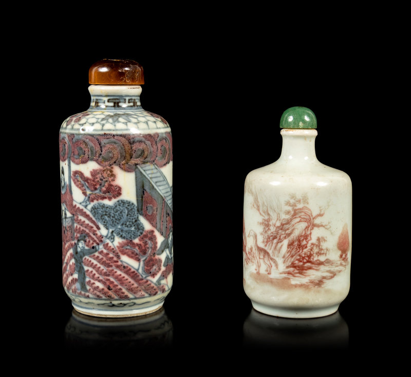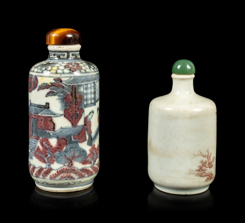 清十九世紀 青花釉裡紅人物圖鼻煙壺及釉裡紅人物圖鼻煙壺各一件