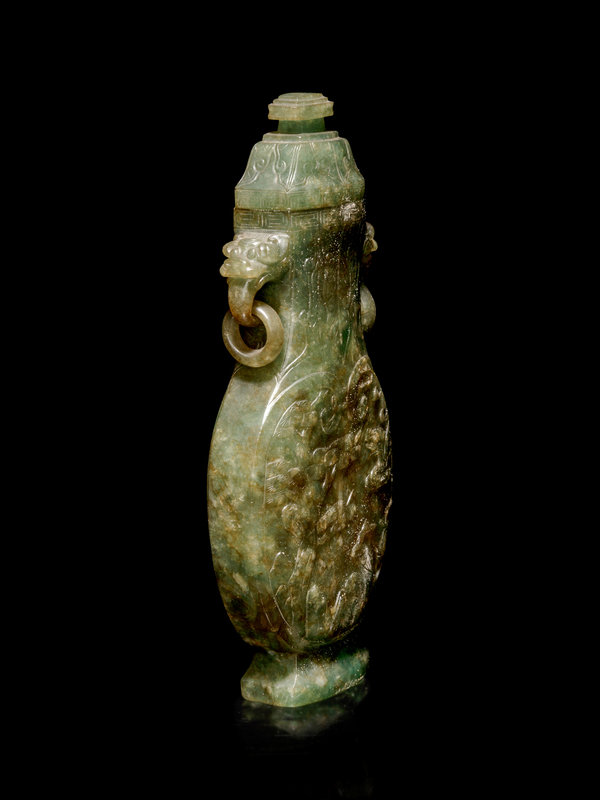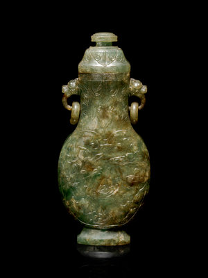清晚期 碧玉雕花鳥紋活環雙耳蓋瓶