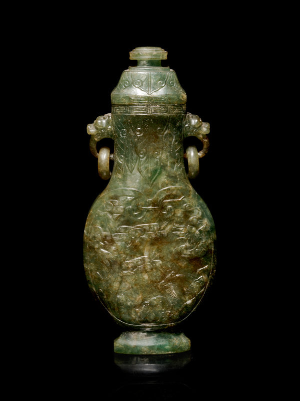 A Carved Spinach Green Jade Ring-Handled Vase and Cover