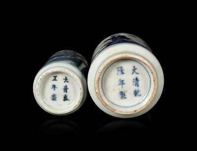 each of cylindrical form, the first painted to show a continuous landscape, bearing an apocryphal Yongzheng six-character mark in underglaze blue to the underside; the second with Daoist immortals, bearing a Qianlong six-character mark in underglaze blue.