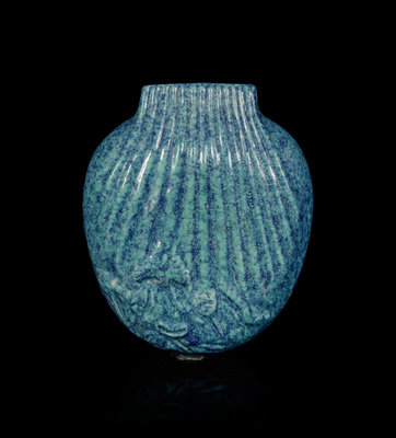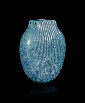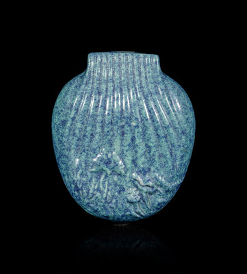 molded in the form of a small purse, carved with relief floral design to the lower part.