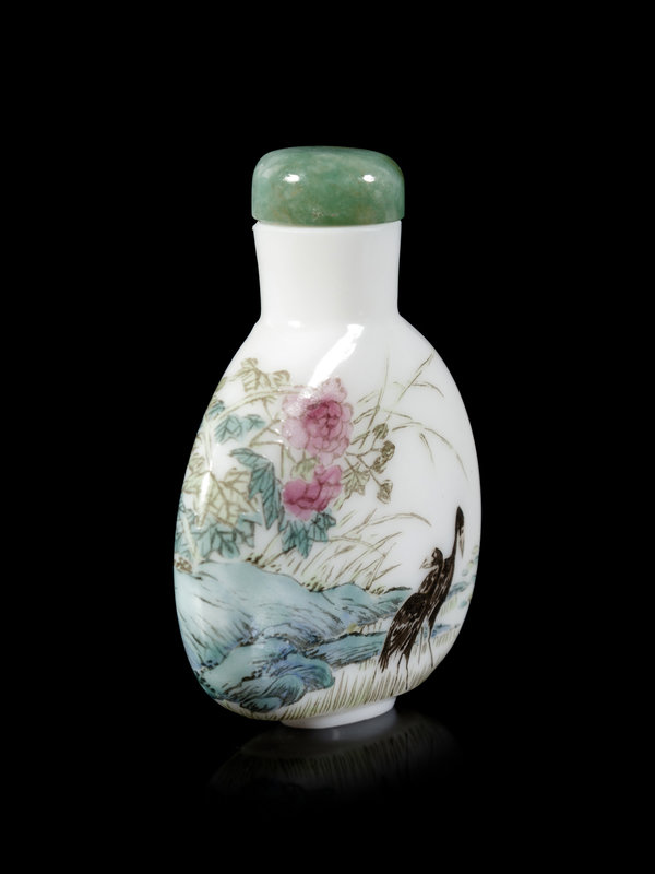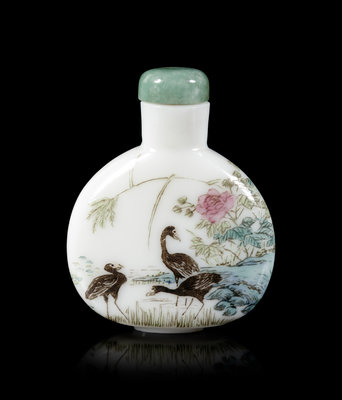 the flattened bottle painted throughout with water birds next to a riverbank, flowering branches issuing from rockwork, with a jadeite stopper.