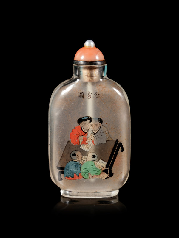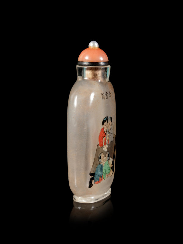 the rectangular bottle painted on one side depicting four boys reading books, the reverse with a poem, signed Ma Shaoxuan, followed by an artist's seal, Shaoxuan, dated the first month in winter in wu shen year (corresponding to year 1908), with a coral stopper.