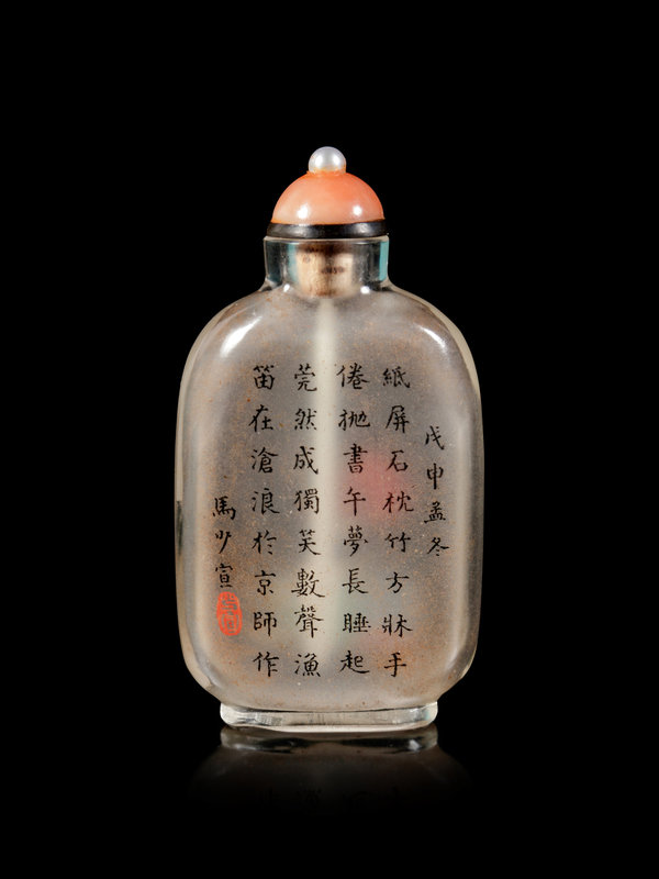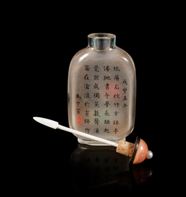戊申(1908)年 馬少宣作水晶內畫念書圖鼻煙壺