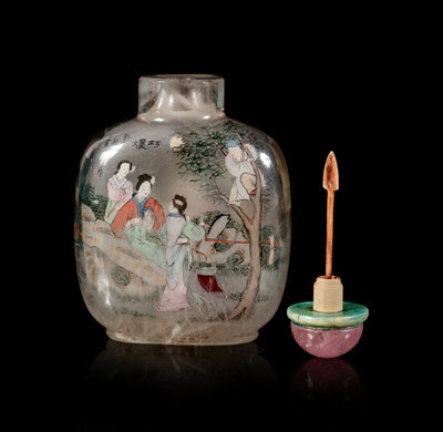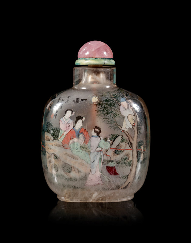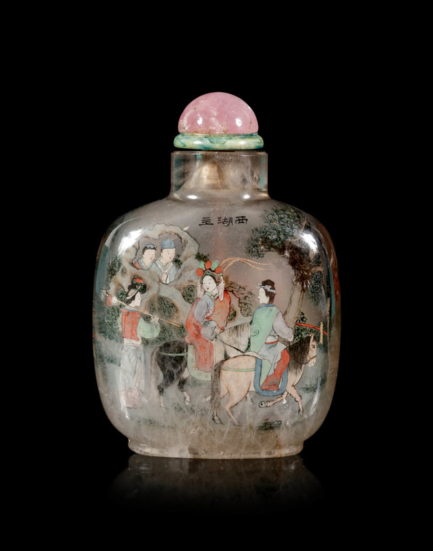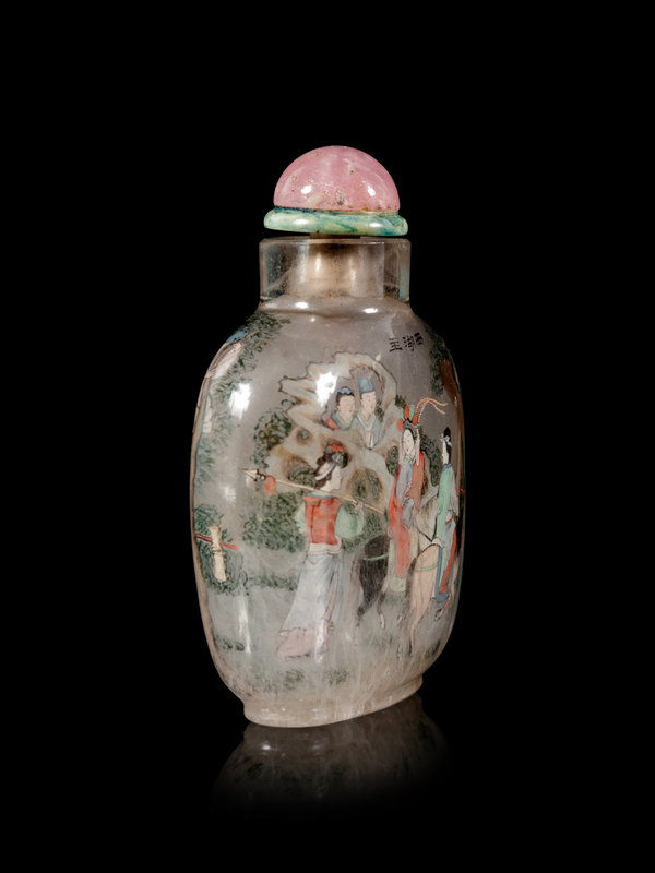decorated on each side with a scene from the Chinese classic Liaozhai zhiyi (Strange Tales Recorded by the Studio of Idle Talk), signed Ye Zhongsan, followed by an artist's seal, dated the fourth month of the lunar calendar in gui chou year (corresponding to year 1909), with a rose quartz stopper.