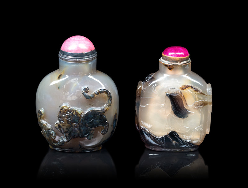 Two Carved Silhouette Agate Snuff Bottles