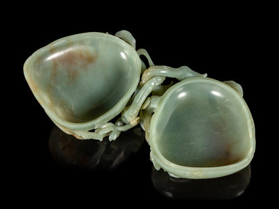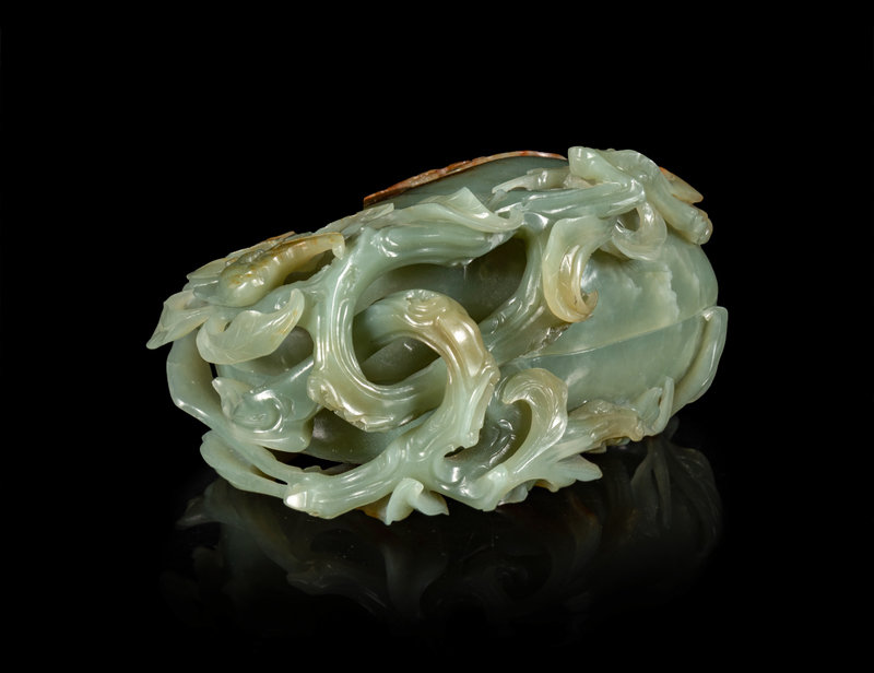the even colored green stone with russet patches, carved from a single pebble as a large peach borne on an interlocked, twisted, leafy branch connecting the box and cover, one part of the branch continuing on the underside to form the base, the other continuing across the cover with a bat rest atop.