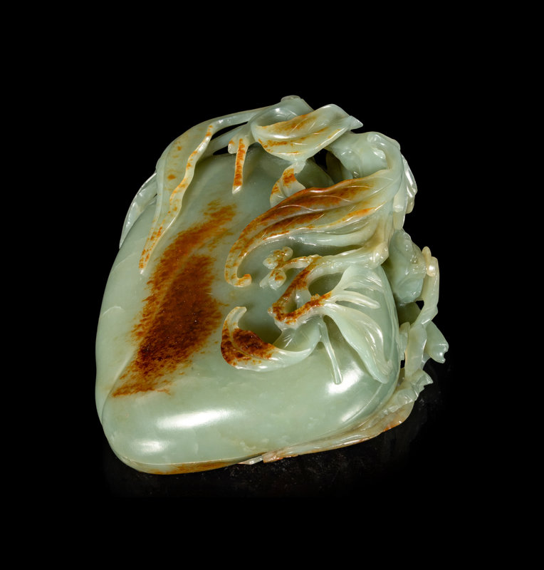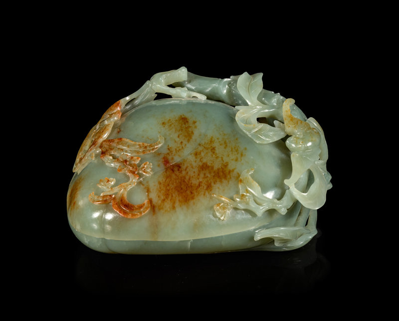 A Russet and Celadon Jade 'Peach and Bat' Covered Box