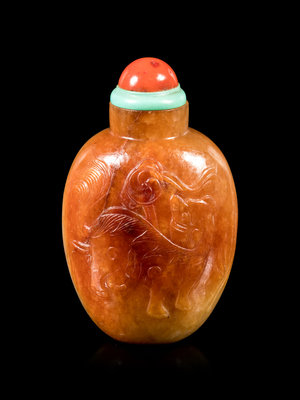 the oval bottle carved in shallow relief depicting a fu lion and a brocade ball, with a coral stopper.