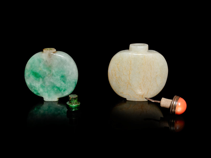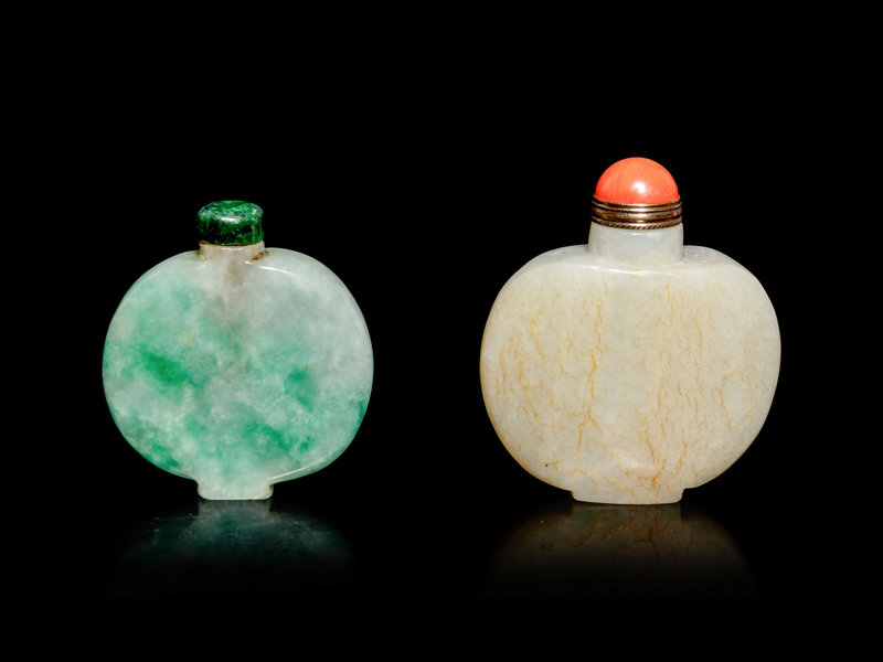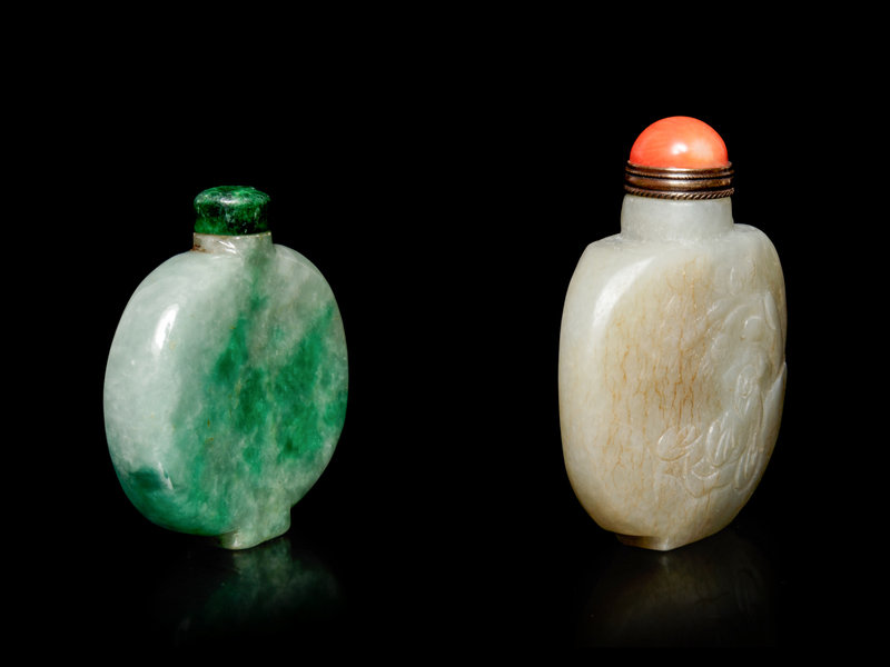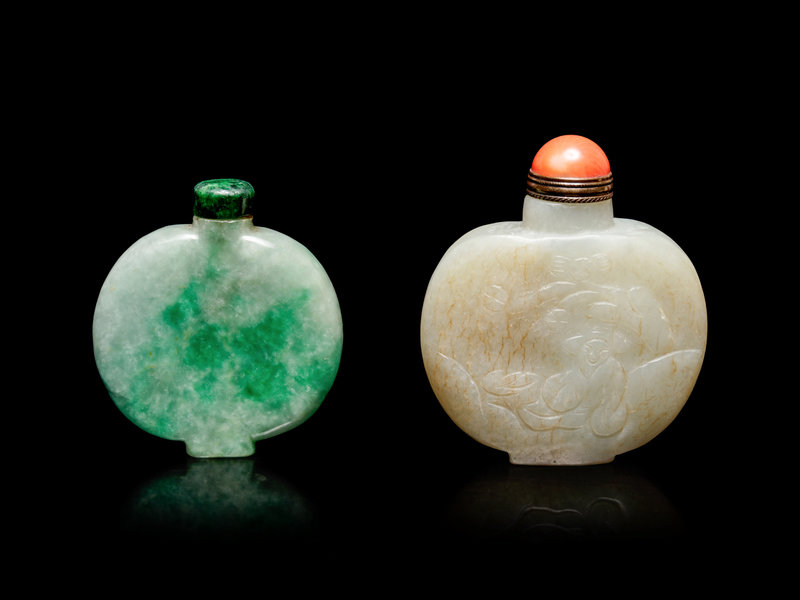 二十世紀 青玉雕山水人物圖鼻煙壺及翡翠光素鼻煙壺各一件