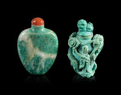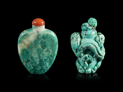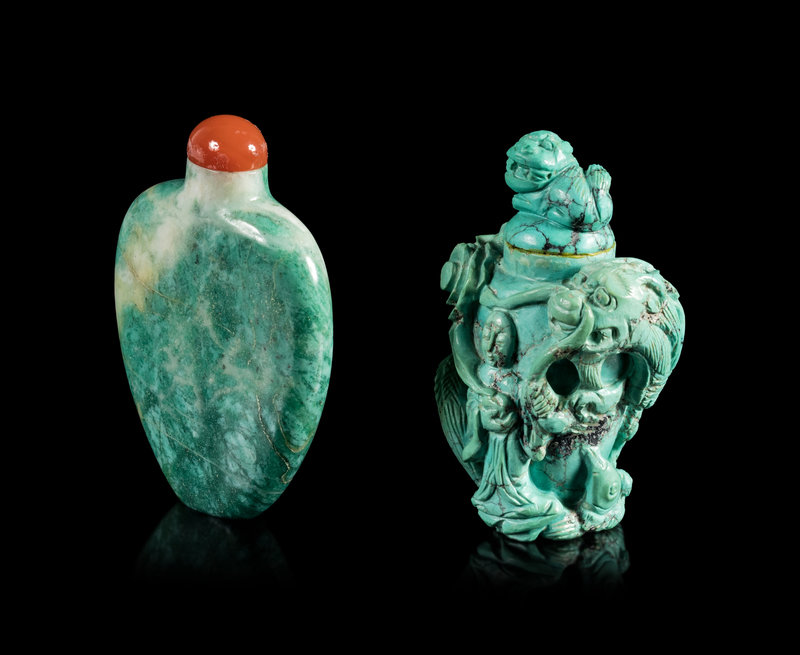 清十九-二十世紀 翠雕光素鼻煙壺及綠松石雕神仙游龍紋鼻煙壺各一件