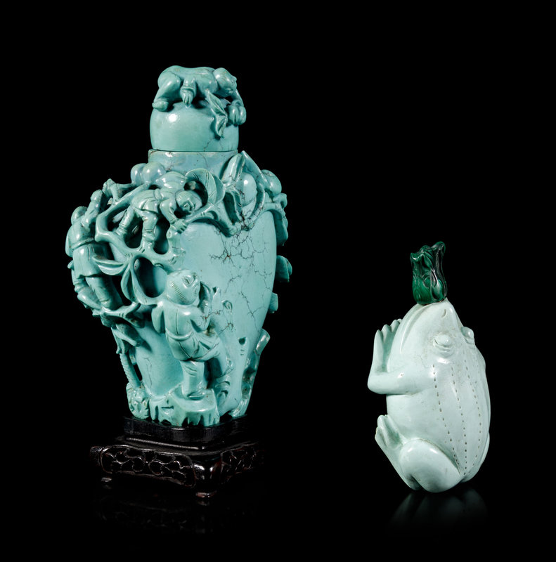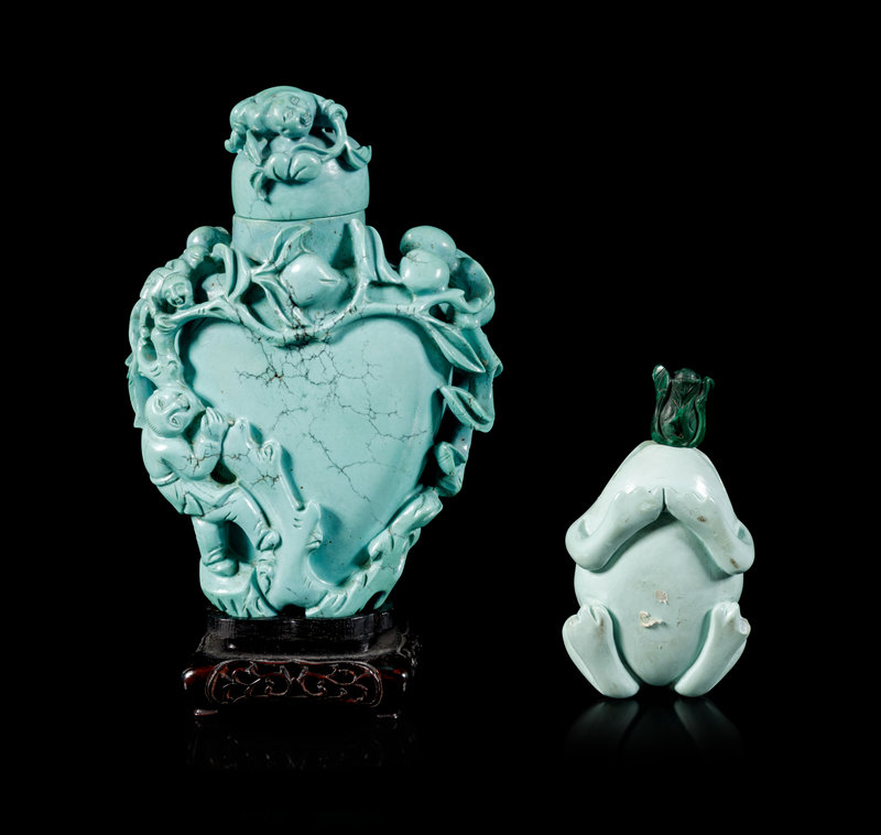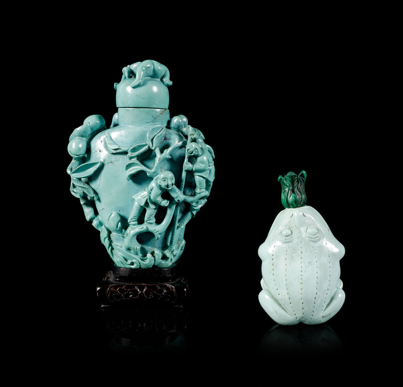 the first a larger bottle carved throughout in high relief depicting four boys climbing onto fruiting peach trees, the turquoise stopper carved with an additional boy figure holding a leafy stem of peaches, raised on a fitted hardwood stand; the second a bottle in the shape of a recumbent frog.