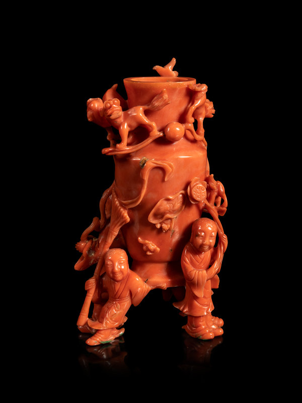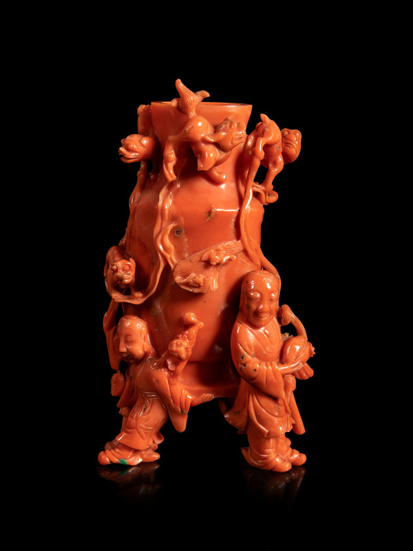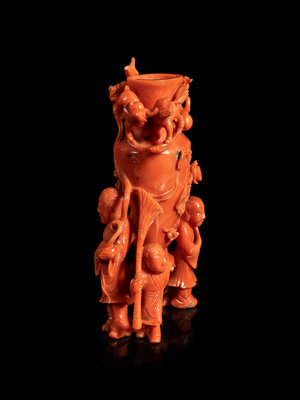 in the form of a miniature vase, the exterior carved to the lower part in high relief showing immortals Hehe Erxian with their attendant, carrying a boom, the neck carved with various puppies.