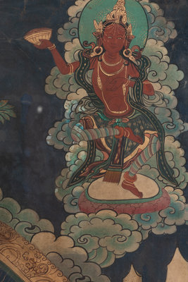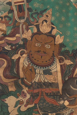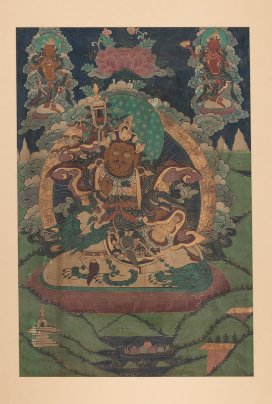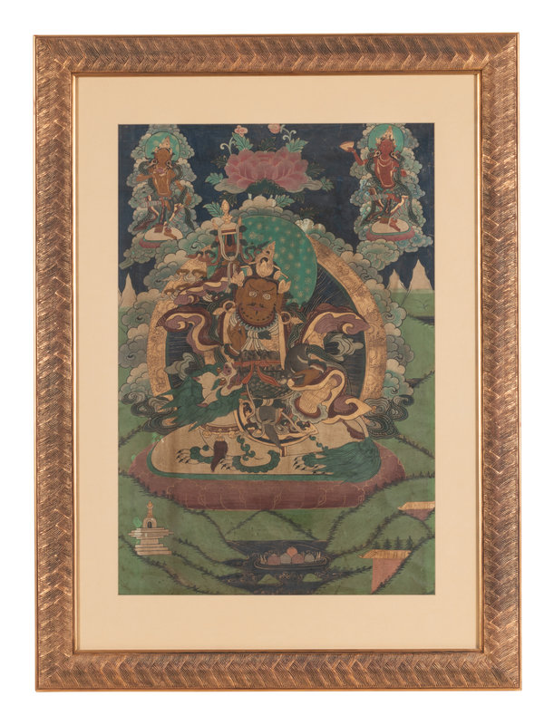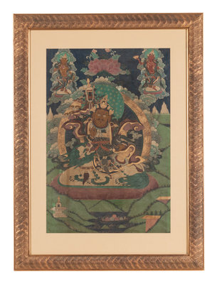 the Bodhisattva depicted at the center seated on a white fu lion, dressed in a full armor, his left hand carrying a mouse, the right hand raised, surrounded by two additional deities, set above a landscape, framed.