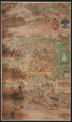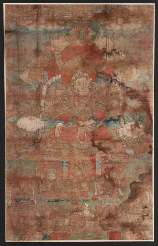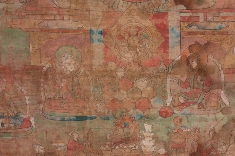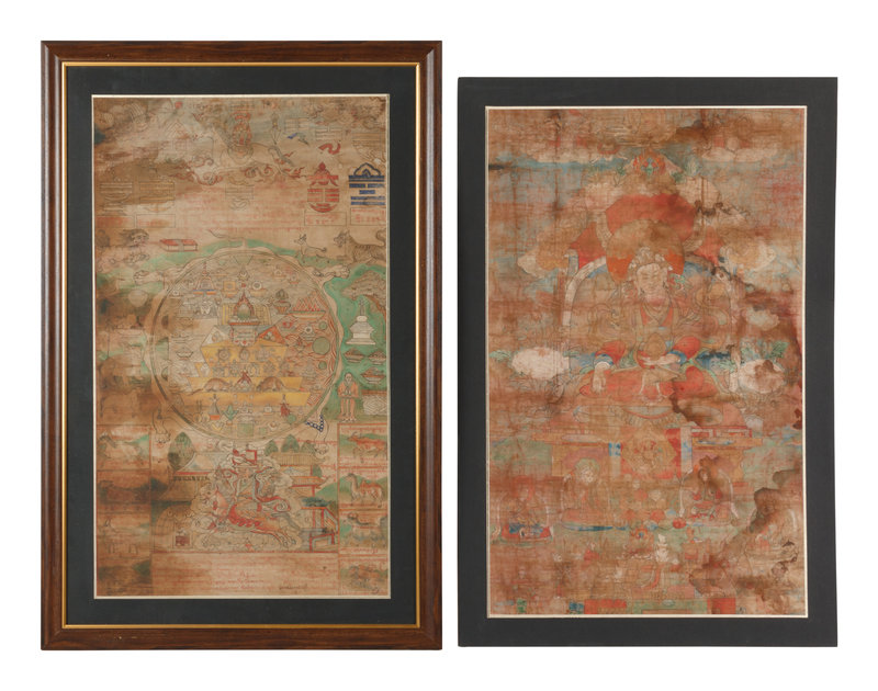 the first painted to depict a central seated Bodhisattva, the second showing a mandala, each framed.