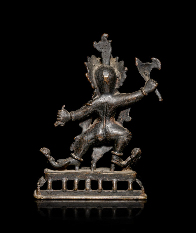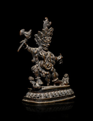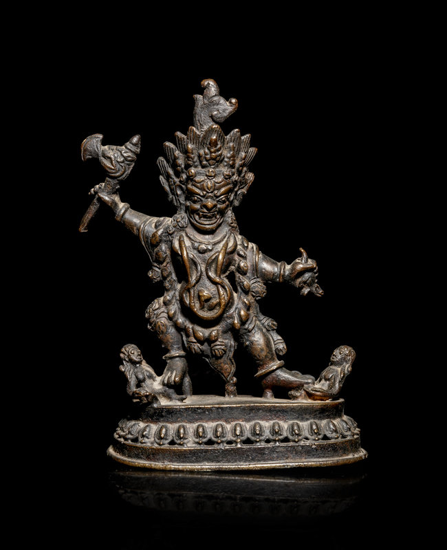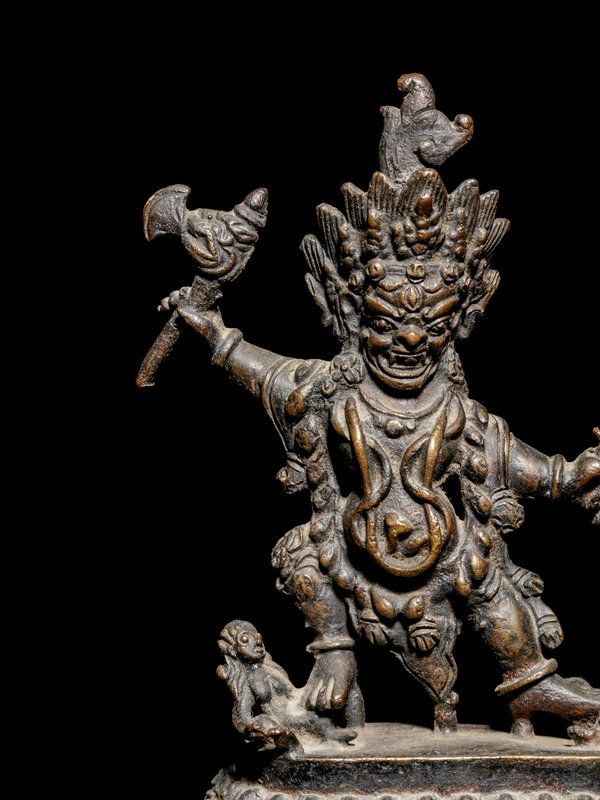the figure cast standing on two servants, the naked body adorned with jewelry and a garland of skulls, his left hand catching a mouse, the right hand raised bearing a chopper, further raised on a lotus base.