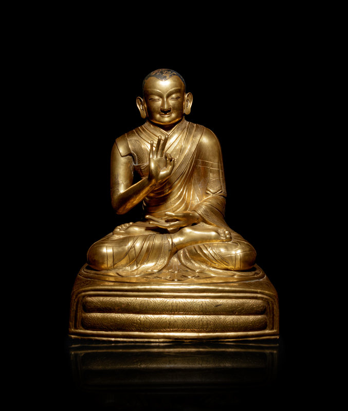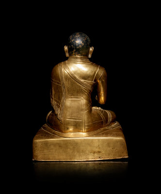 A Large Sino-Tibetan Gilt Copper Repoussé Figure of a Seated Lama