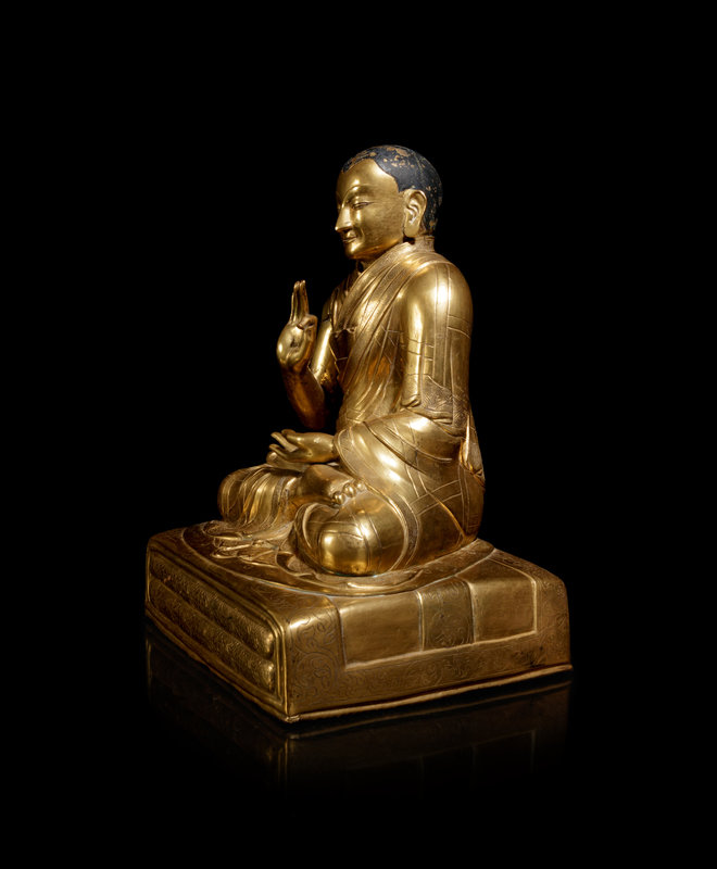 the figure depicted seated in vajrasana on a cushion base engraved with floral design, his right hand raised in vitarkamudra, the left hand resting on his lap, wearing elaborate robes, the face bearing a subtle smile, having black painted short hair, the base engraved with a large lotus.