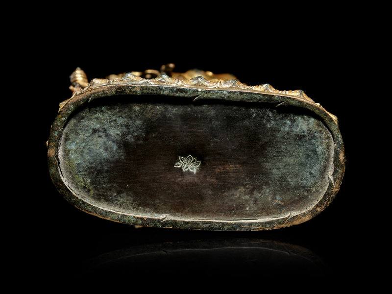 the deity depicted standing on two servants, further raised on a lotus base, the naked body adorned with elaborate jewelry and a large garland of severed heads, her left hand raised and holding a skull cup, her right hand extended behind and clutching a chopper.