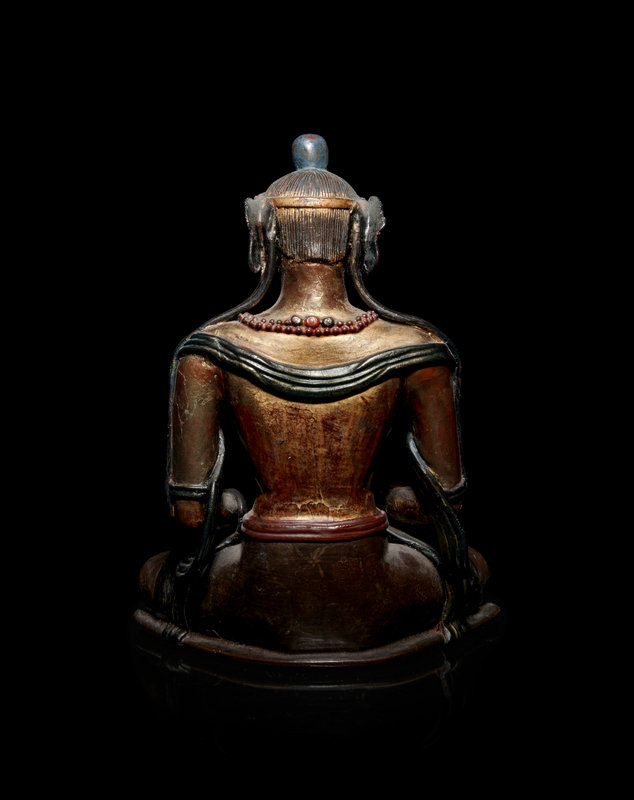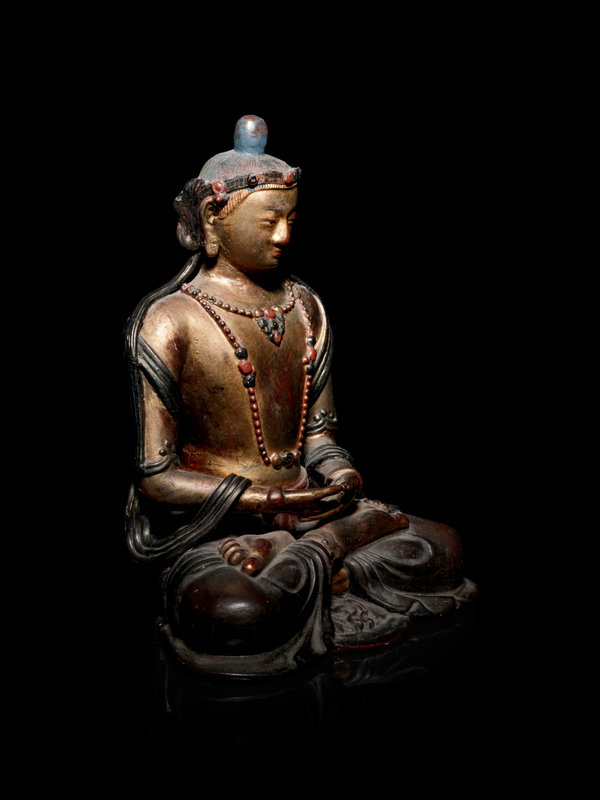 A Mongolian Gilt and Polychrome Painted Wood Figure of Amitayus