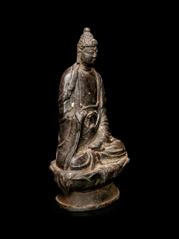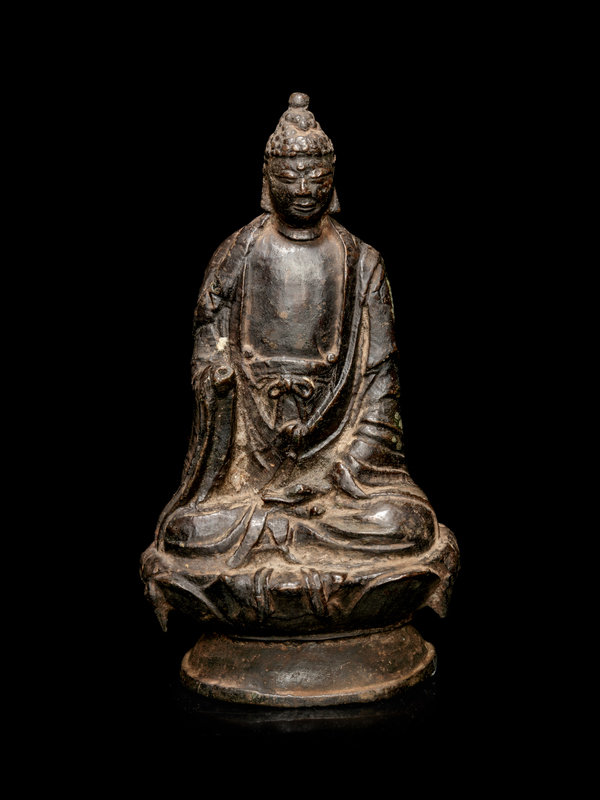 the Buddha figure depicted seated in dhyanasana on a raised lotus base, wearing high-waisted garments with a draped shawl, the face cast with a calm expression, his hair in tight knots sumounted by a ushnisha.