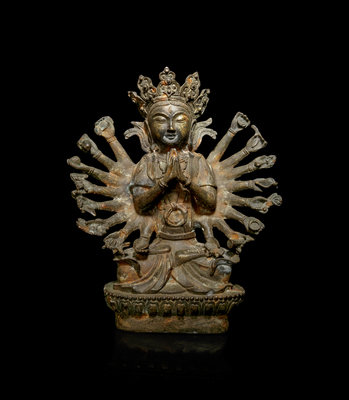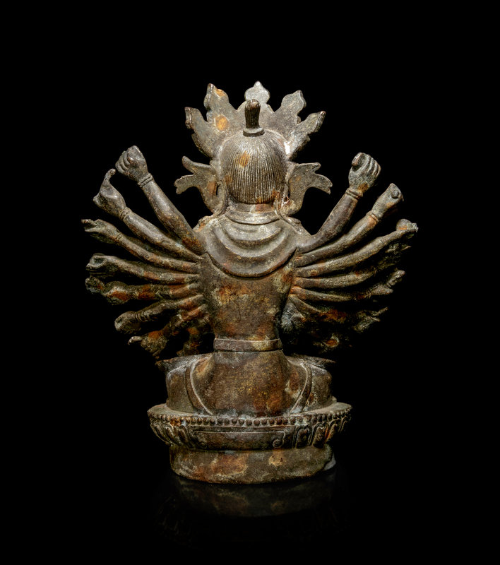 the Bodhisattva depicted seated in dhyanasana on a lotus base, the primary hands clasped in front of the chest, the further pairs of hands bearing various attributes, dressed in draped robes, wearing elaborated beaded necklaces, the face cast with a subtle smile underneath a five-peaked crown.