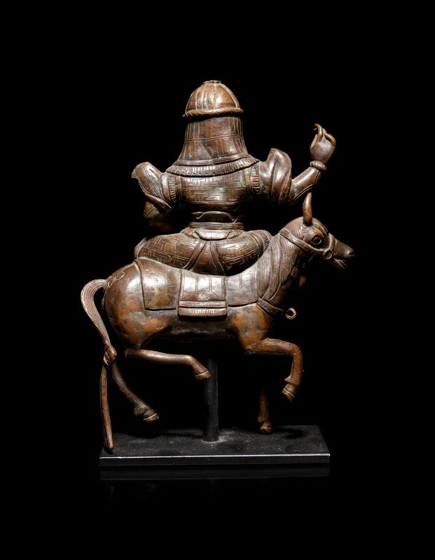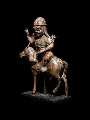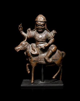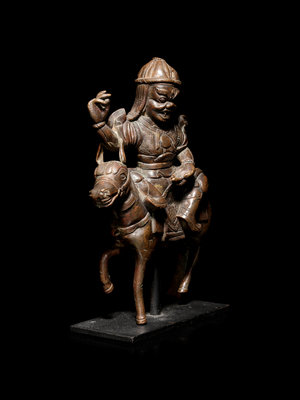 the wrathful figure depicted riding on a donkey, dressed in a full armor and wearing a helmet, the left hand lowered and the right hand raised, raised on a later metal stand.