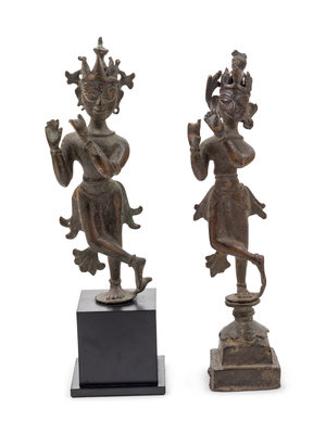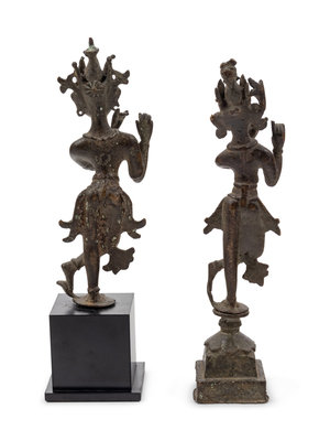 each depicted standing with both legs crossed, both hands raised as if playing a musical instrument, wearing a tall headdress.