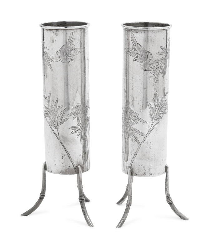 二十世紀 中國外銷銀竹鸟纹瓶一对