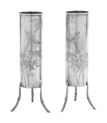 each of cylindrical form, the straight walls rising to a lipped mouth, the exterior chased to show a bird perched atop bamboo branches with another in flight above it, supported on three legs in the shape of bamboo stems.