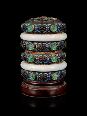 A Jadeite and Hardstone Inset Enameled Jewelry Box and Cover