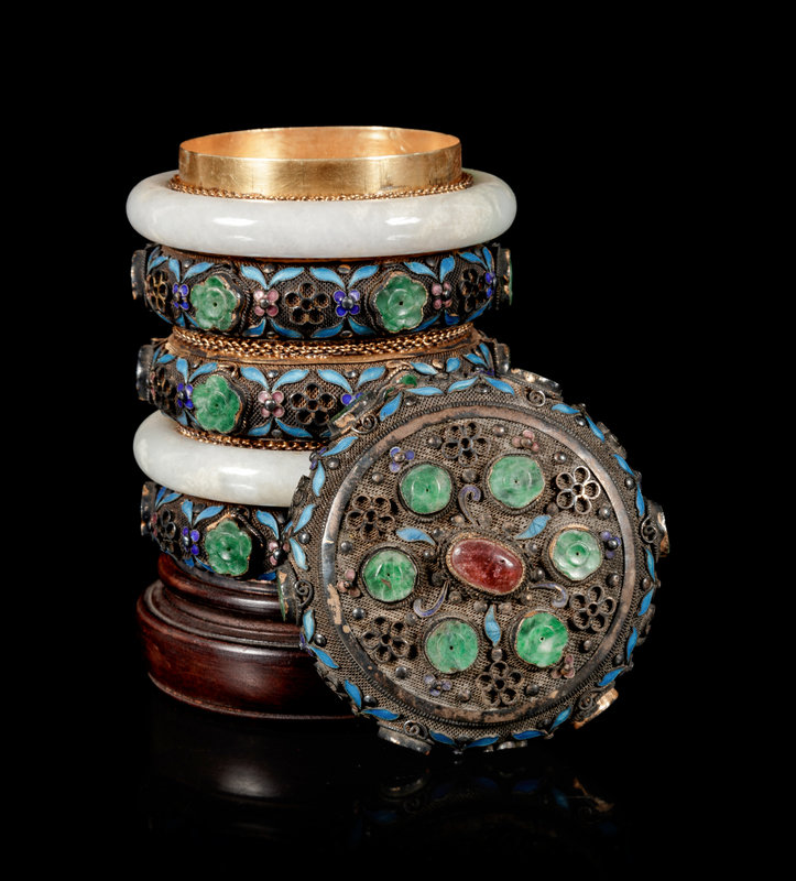 of cylindrical form with reticulated 'prunus' motifs, inset with jadeite, tourmaline and a pair of pale celadon jadeite bangles.