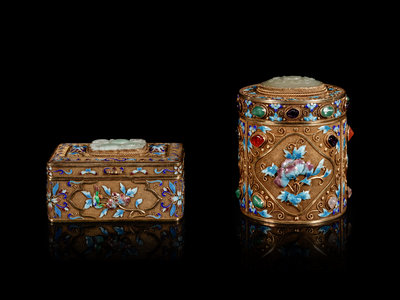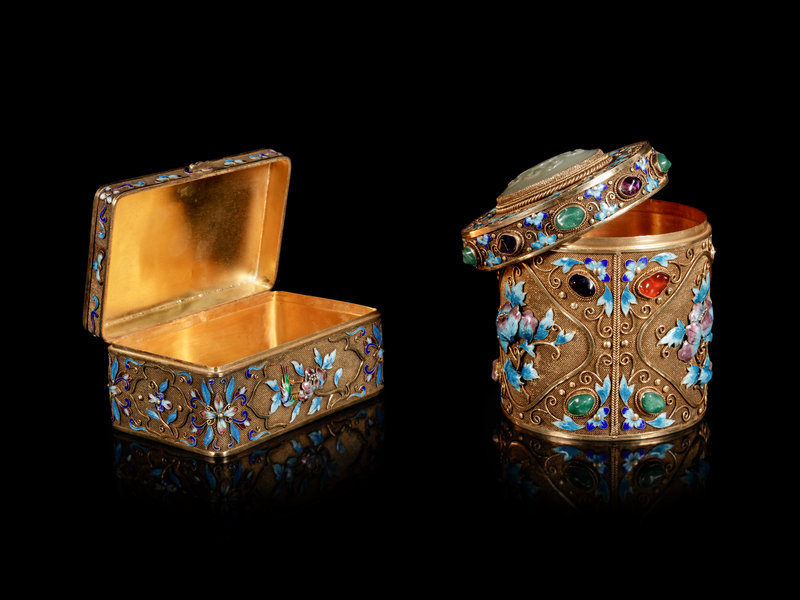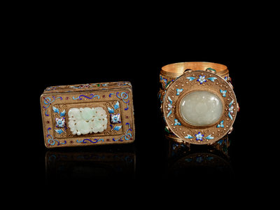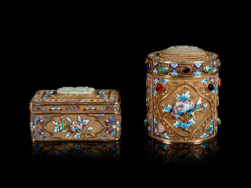 清晚期 累絲琺瑯嵌玉蓋盒兩件